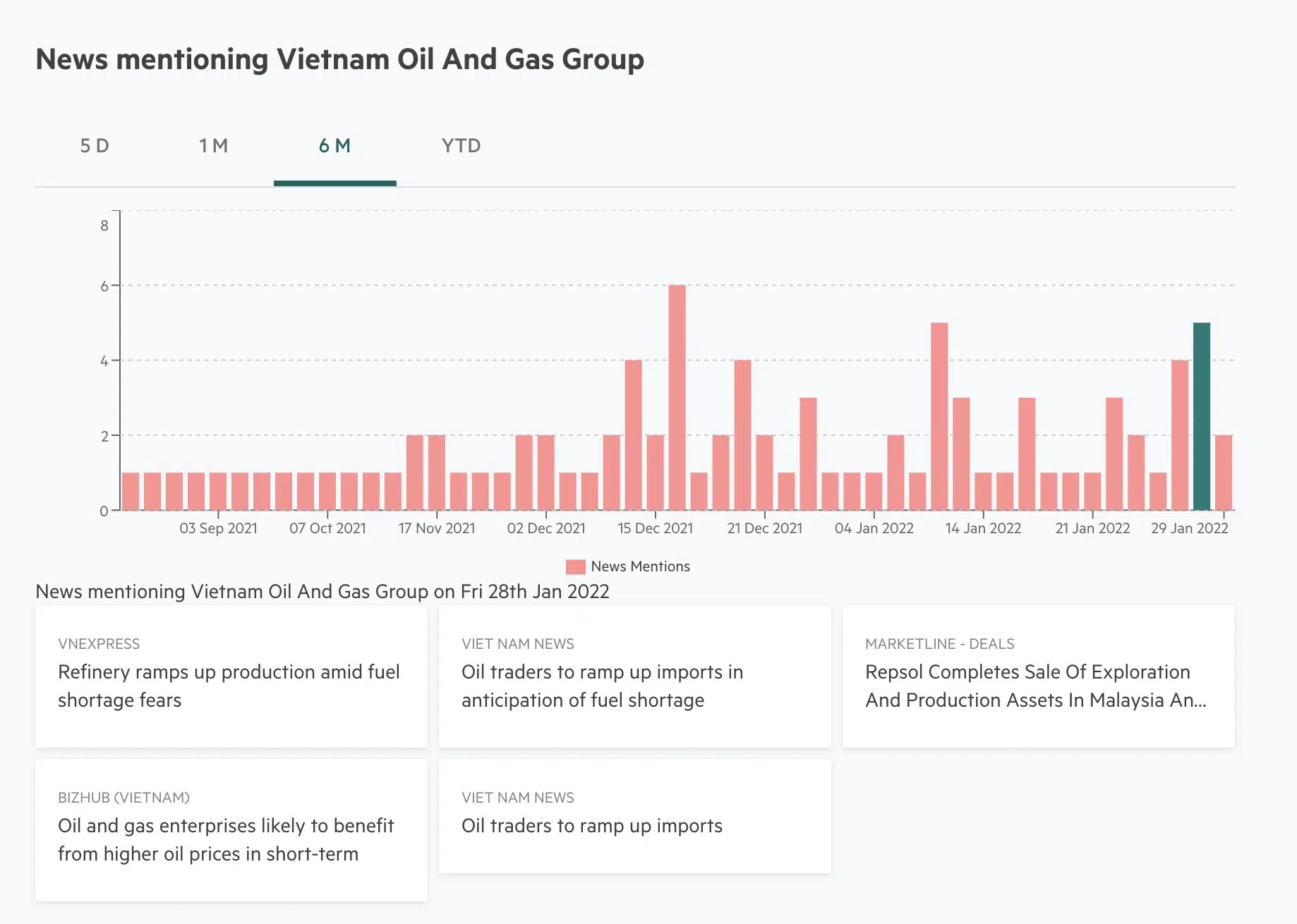 You can see the momentum of news mentions on the company you are researching. If you click on a particular column, it gives you a list of the sources & articles that mentioned the company on that day.